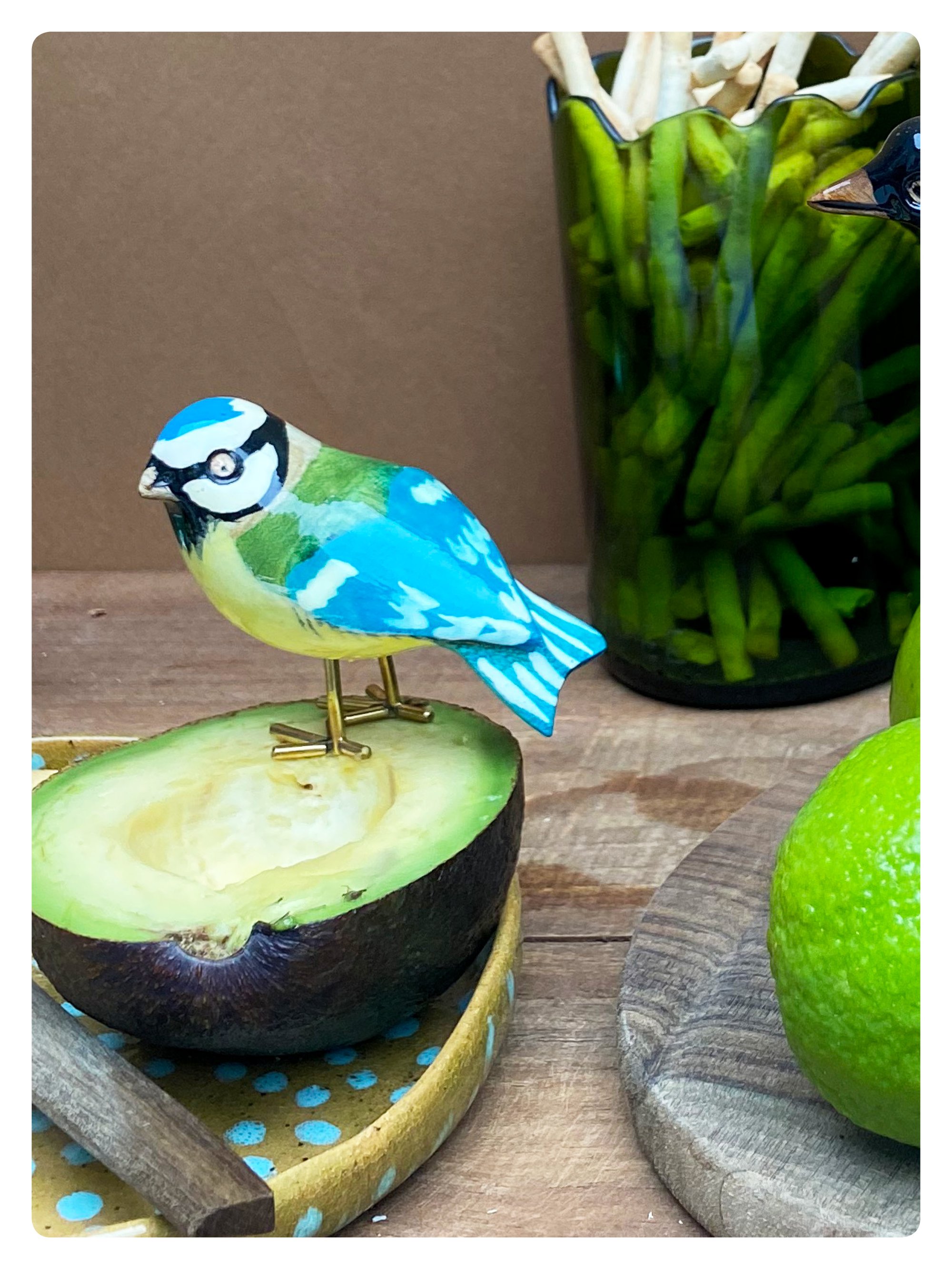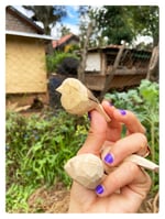 Petite mésange sculptée dans du bois de jacaranda, avec pattes en laiton recyclé (cadenas et robinet fondus), taille approximative: H5 L6 l3 cm. Livrée dans une pochette en draps de seconde main.